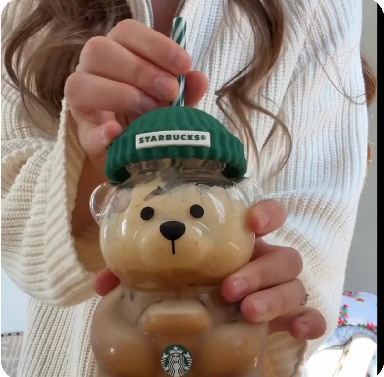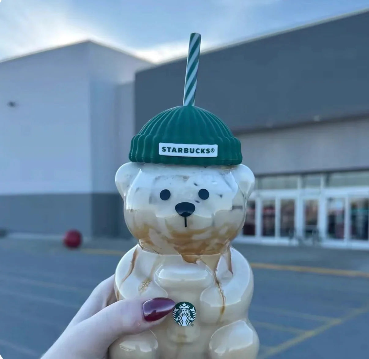 L’ours arbore un petit bonnet vert façon Starbucks et un corps transparent permettant de voir la boisson à l’intérieur.